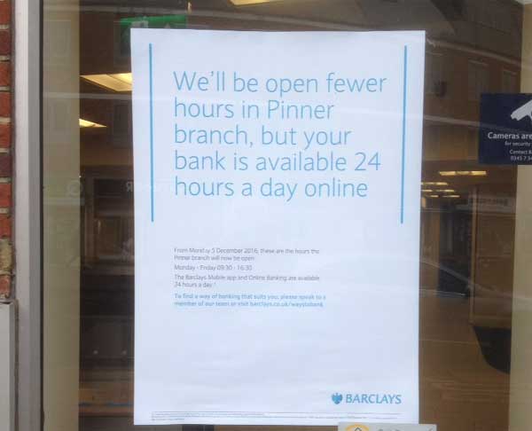 Sad to read this in Barclays Bank Pinner squeezing down opening times. Is this the real way to deliver customer service.