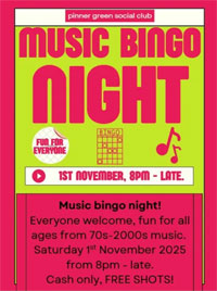 Sat 1 November Music Bingo Night. Check what else is on their website www.pinnergreensocialclub.com/entertainment