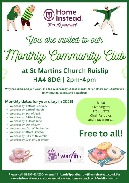 Home Instead Community Club 2nd Wednesday each month at St Martins Church Hall Ruislip HA4 8DG