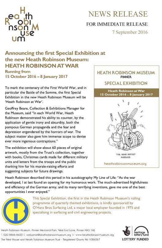 Geoffrey Beare says “I take great pleasure in welcoming visitors to this first special exhibition in the Joan Brinsmead gallery. The theme of Heath Robinson at War was chosen because the opening coincides with the 100th anniversary of the battle of the Somme and because West House is a war memorial, but most importantly to celebrate the enormous contribution that Heath Robinson made to the maintenance of morale, for both servicemen and civilians, in two world wars.”