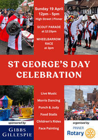 19 April. The annual St. George’s Day celebrations are organised by Pinner Rotary and are held in Pinner Village High Street on a Sunday in April close to St George’s Day which falls on April 23rd. The picturesque High Street is closed to traffic for the day and transformed into a family friendly venue for celebrating the patron saint of England, St George.